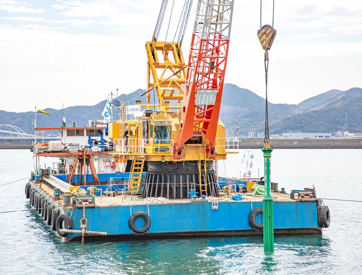 クレーン船やバックホウ船などを保有する作業船舶は21隻(令和7年度時点)。小さな漁港の浚渫から広大な埋立地の工事まで、規模や地形に関係なく対応でき、自社で完結できる施工の多さはそのまま技術力に直結しています。